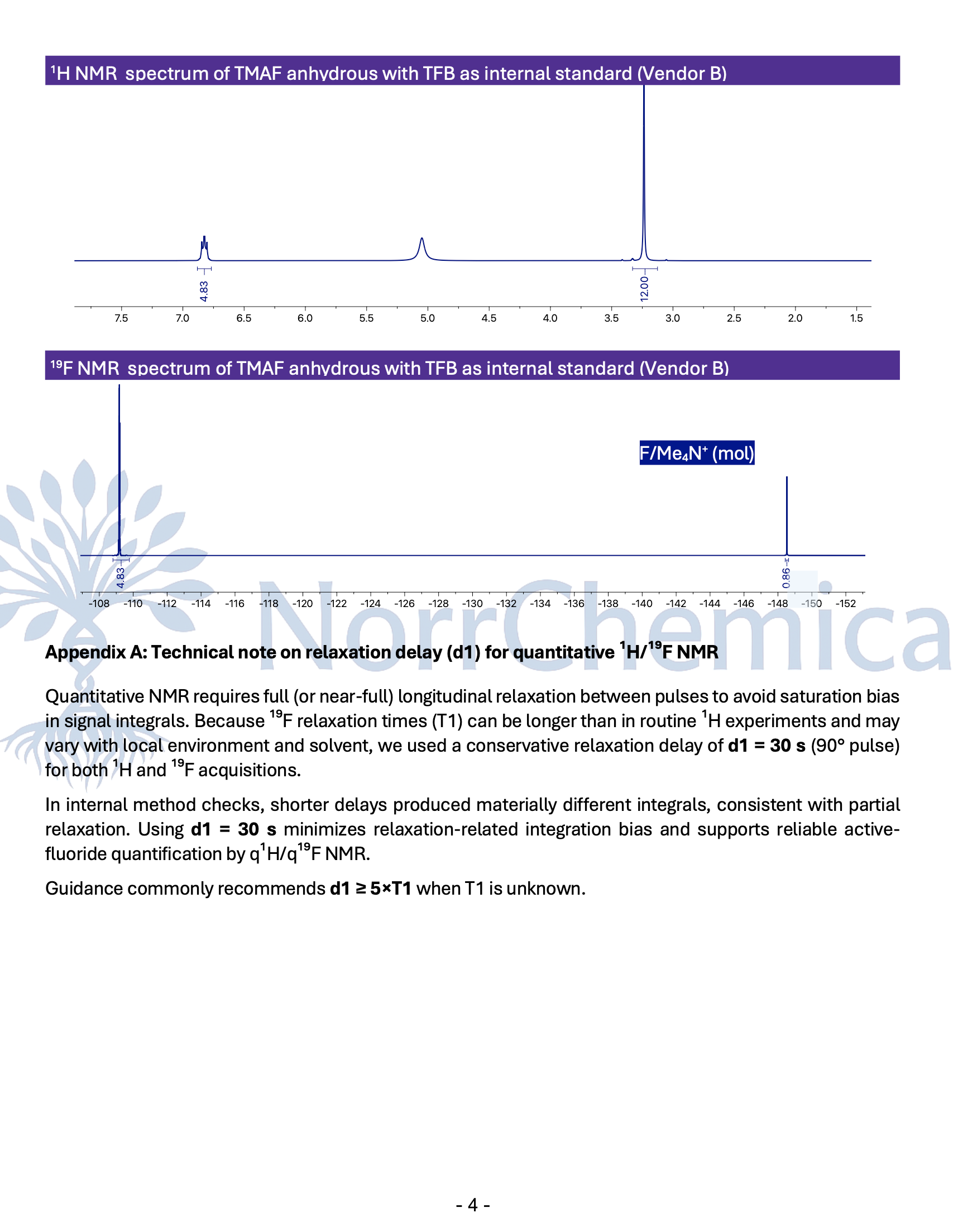 Many fluoride assay workflows use acquisition settings optimized for speed rather than quantification. Because quantitative NMR requires sufficient recycle delay (typically ≥5×T1), we acquire both 1H and 19F spectra under fully relaxed conditions (d1 = 30 s) and apply baseline-controlled integration. This prevents the large apparent assay swings that can occur when d1 is shortened or baseline drift is not handled rigorously. A downloadable qNMR report is provided with spectra, integrals, and the F/Me4N+ calculation.